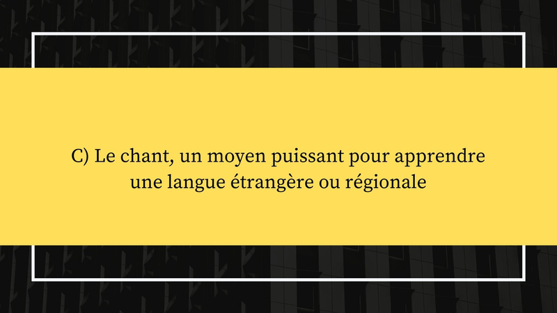 "Une pratique joyeuse, de cohésion, de lien, de joie" selon l’ex-ministre de la Culture Françoise Nyssen (2017), le chant s’est imposé depuis la rentrée 2019 dans les programmes comme un élément central avec l’engagement du Ministère de l’Éducation Nationale d’incorporer une chorale par école. Néanmoins, outre l’apport disciplinaire spécifique que la musique amène, le chant s’avère également une porte d’entrée dans les langues étrangères ou régionales des plus appropriée : préconisé pour l’apprentissage de la langue native à la maternelle (cf. : la méthode verbo-tonale, méthode utilisant parole et voix chantée pour corriger les erreurs dans la prononciation phonétique, Gavard F., 2018) il s’impose par association naturellement comme un outil indispensable dans l’entrée en matière des langues étrangères et régionales comme dans la suite des phases d’apprentissage.