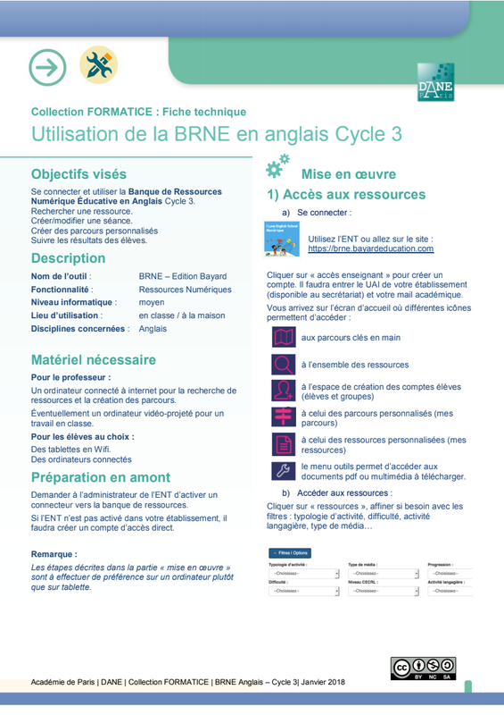 Les Banques de Ressources Numériques Éducatives (BRNE) sont un outil mis en place par le ministère de l’éducation nationale. Elles regroupent différentes ressources utilisables aux cycles 3 et 4. En ce qui concerne les langues vivantes, les BRNE proposent différentes activités pour l’anglais : des flashcards audio, des jeux de memory, de classement. Ces activités permettent de travailler l’oralité de la langue surtout au travers de la répétition. De plus, l’enseignant peut différencier les apprentissages en permettant à chaque élève de travailler individuellement sur une tablette des exercices correspondants à son niveau. Ainsi, cette modalité de travail permet aux élèves d’acquérir une certaine autonomie et à la classe de fonctionner en ateliers ou en groupes de besoin. Enfin, le professeur des écoles dispose d’un outil de suivi des résultats de ses élèves (temps passé, pourcentage effectué, …). Autre avantage à cette application : les élèves peuvent y avoir accès depuis chez eux afin de continuer à s’entraîner si besoin ou bien de pouvoir poursuivre l’apprentissage à la maison tout en étant suivi par leur professeur.